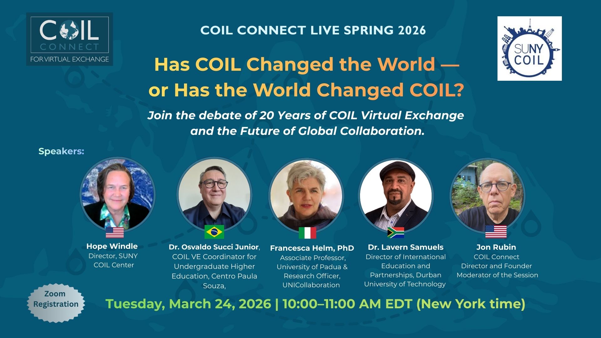 Em 24 de março às 11h (horário de Brasília), o webinário “Has COIL Changed the World — or Has the World Changed COIL?” conta com participações de Hope Windle (SUNY COIL Center, EUA), Francesca Helm (Università di Padova, Itália), Lavern Samuels (Durban University of Technology, África do Sul) e com moderação de Jon Rubin, criador da abordagem COIL e da Fundação COIL Connect (EUA).